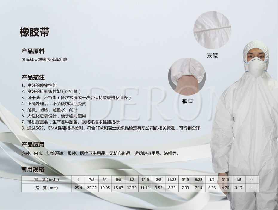 医疗防护产品:医用松紧带、医用橡胶绷带、一次性止血带、橡胶丝、纱包丝是应用在医疗防护作用, 保障医、患人员的医疗健康 查看更多》