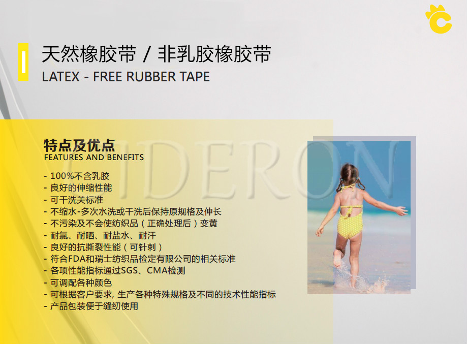 简介: 泳衣系列橡胶带分“天然橡胶带”与“非乳胶橡胶带”。可用于制作女士/小孩泳装,还可用于制作内衣、沙滩裤、服装、无纺布制品、运动健身用品等产品。