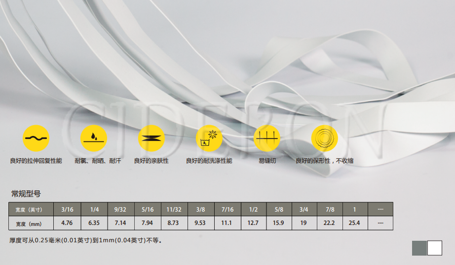 内衣泳衣产品:橡胶片、橡胶花纹带、橡胶带、松紧带是应用在泳装、内衣、沙滩裤、服装、运动健身用品、浴帽… 查看更多》
