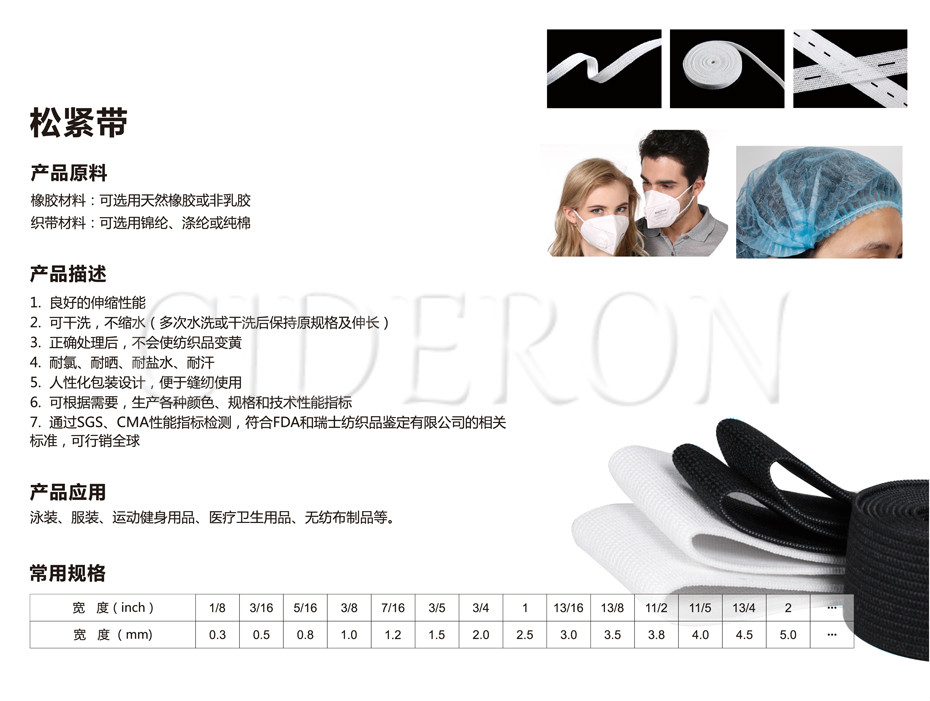 简介: 松紧带作为服装辅料,特别适合于内衣、婴儿服装、运动服、婚纱礼服、T-恤、帽子、胸围、口罩、泳装等服装系列产品;还可用作于医疗卫生用品、无纺布制品、运动健身用品等产品的辅料。