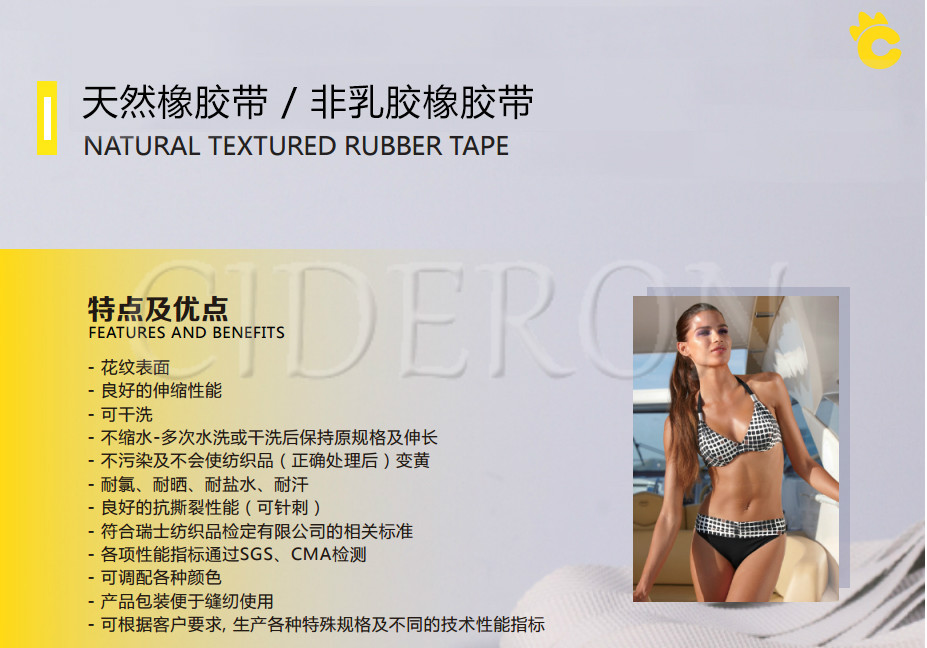 内衣泳衣产品:橡胶片、橡胶花纹带、橡胶带、松紧带是应用在泳装、内衣、沙滩裤、服装、运动健身用品、浴帽… 查看更多》